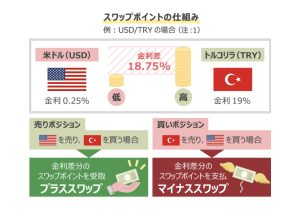 高金利通貨を買って低金利通貨を売った場合にスワップポイントが発生し、逆の場合にはスワップポイントを支払う必要があります。